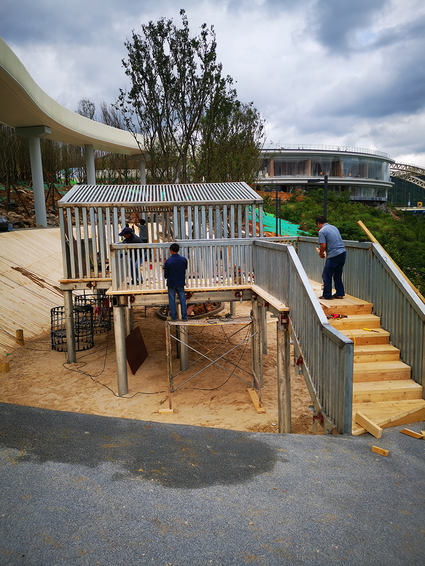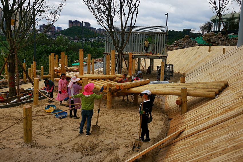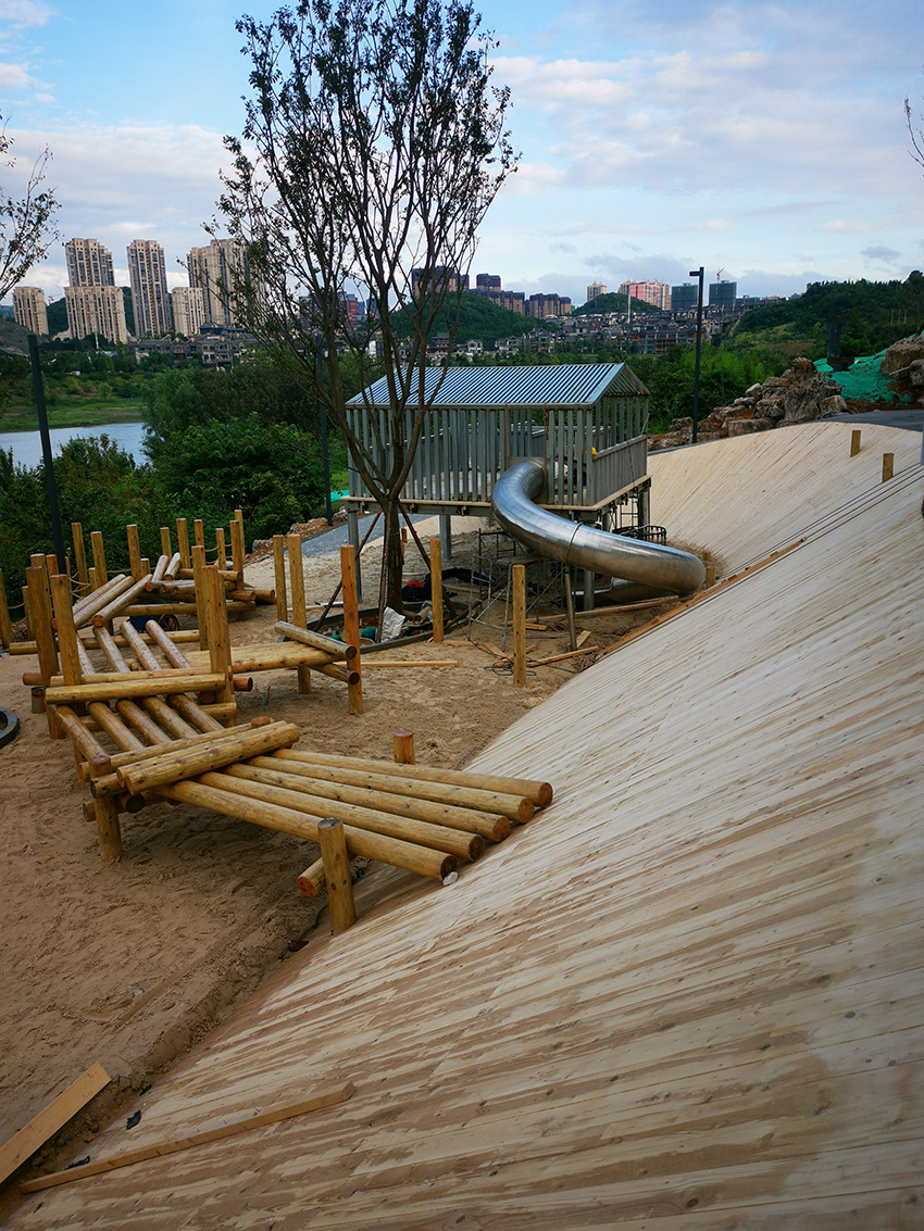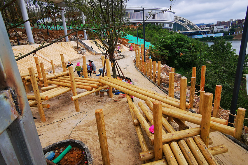 本次施工以不锈钢景观滑梯和木质平衡步道等元素为主,通过攀、爬,跑、跳等动作,锻炼平衡力及四肢协调能力。