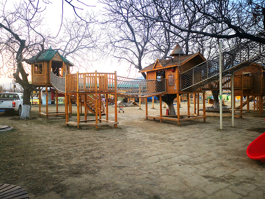 树屋和树屋之间采用网绳结构和浮桥做连接,成为树屋间的纽带,孩子们可以从任何一个树屋,然后到达其树屋,既增加了难度,又增加了可玩性,让孩子们的能力得到锻炼。